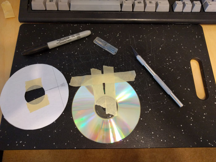 The Lite-On drive here is what I used to get past the sync error. It happily chews through the magic marker, but gets really confused by straight lines cut in the data surface. You can see how what should be three distinct peaks on the right get merged into one giant error blob.